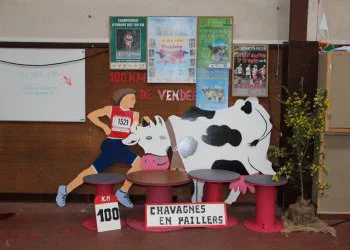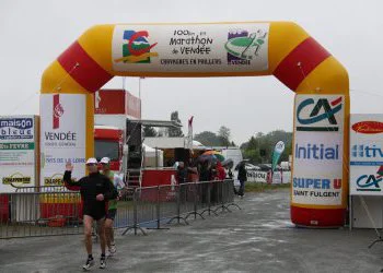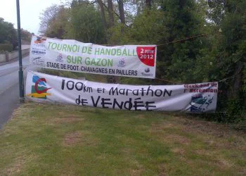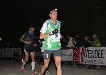 Le circuit se compose d’une petite boucle de 778 m, suivie de 6 tours de 16,537 km (ce n’est pas la peine de prendre votre calculatrice, j’ai vérifié, ca fait bien 100 km). Le coup de feu retentit à 5h. Un peu plus de 260 inscrits. Un défilé de frontales s’évanouit dans la campagne. Sur les conseils glanés sur le site de Bruno Heubi, j’ai disposé, sur les 3 ravitaillements du tracé, ma boisson énergétique riche en sodium et minéraux, expérience que je renouvellerais car je pense que ca m’a bien aidé. Le temps est sec mais frisquet et pour l’instant, Eole maitrise encore ses nerfs. Je pars sur des bases plus prudentes que prévues, à savoir autour de 11,5 km/h. Benoit me rejoint assez rapidement et me faussera compagnie vers la fin du 1er tour pour claquer un superbe chrono. Entre-temps, la pluie s’est invitée et ne nous lâchera pratiquement plus jusqu’à la fin. Traditionnellement, le carillon de l’église retentit à chaque passage d’un participant : surement très agréable pour les riverains. Le 1er tour est avalé en 1h33, je suis mouillé mais c’est supportable. Je croise encore quelques concurrents : j’en dépasse certains, d’autres me mettent un vent, comme dirait quelqu’un du site. Le parcours ne comporte pas de grosses difficultés, hormis quelques faux-plats. Néanmoins, le vent, qui s’est maintenant levé, puis les passages dans la forêt de Graslas et la partie terreuse avant l’entrée dans Chavagnes-en-Paillers vont devenir de plus en plus impraticables. 2ème tour en 1h31.