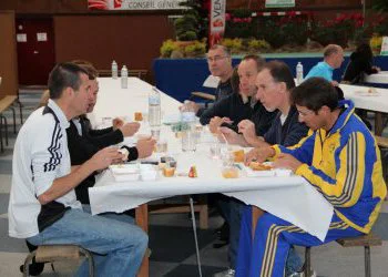 Je pars me mettre au sec dans le camping-car de mes amis puis vais récupérer mon trophée. Un plateau-repas nous est offert dans la salle des sports attenante à l’arrivée. J’y retrouve un Marc frigorifié qui attendait les clés de ma voiture pour récupérer ses vêtements et aller prendre sa douche. Après de longues minutes d’attente, Juan fait enfin son apparition, tout sourire, comme d’habitude. Maintenant, c’est moi qui peut partir prendre ma douche à l’hôtel. Je reviens, pas frais et pas dispos, pour partager une coupe de champagne avec mes amis. La bouteille était prévue pour mon record éventuel mais, du coup, servira pour le podium de Benoit. Il est l’heure d’aller déguster la paella (il est vrai que ca fait déjà 4h que nous venons de finir de manger mais malgré tout, nous avons encore faim). On se précipite sur le buffet. Enfin, il serait plus honnête de dire : l’équipe gériatrie Pcap atteint, tant bien que mal, le buffet. Voilà, il est maintenant temps de se quitter. Mes 4 comparses se retrouveront au Grand Raid du Morbihan le mois prochain.