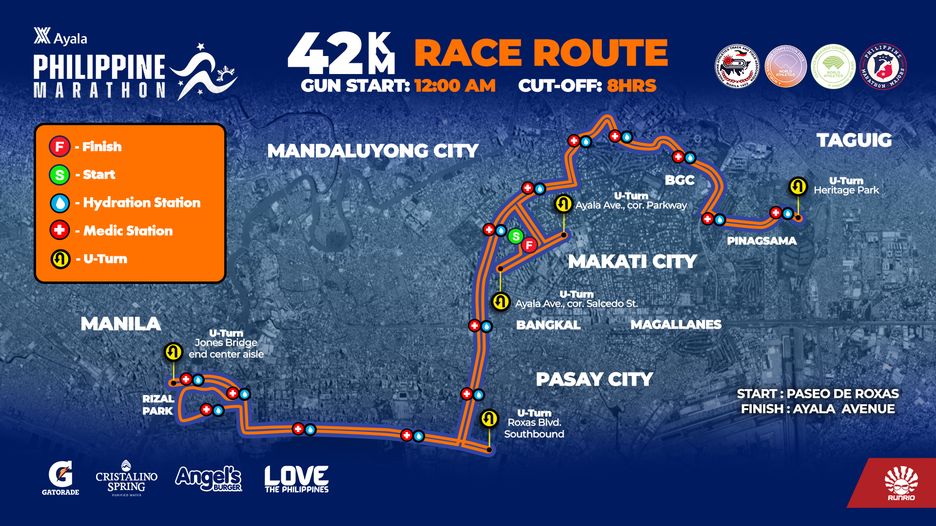L’événement se déroule majoritairement sur des routes urbaines asphaltées traversant Makati et zones voisines, avec départ et arrivée autour de l’Ayala Triangle.