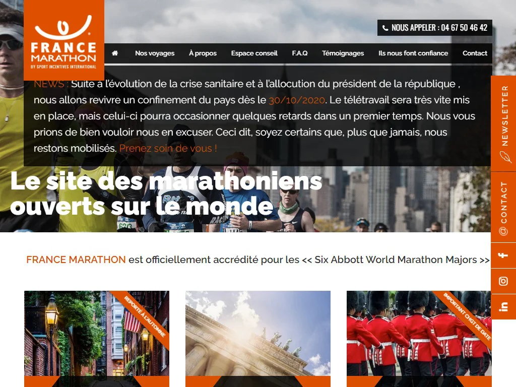 Le site des marathoniens ouverts sur le Monde ! France Marathon, c’est avant tout une équipe de sportifs passionnés épaulée par des professionnels du tourisme présents sur le circuit running depuis 1982, pionniers dans l’organisation des voyages sportifs et touristiques pour marathoniens. Grâce a ses liens étroits tissés au fil du temps dans le monde de la course à pied et du tourisme, France Marathon vous libère des contraintes et vous laisse ainsi l’esprit libre pour préparer la course de votre choix en réalisant en toute connaissance vos déplacements sportifs dans les meilleures conditions. France Marathon est officiellement accréditée par les Six Abbott World Marathon Majors : Marathon de Tokyo, Boston, Londres, Berlin, Chicago & New-York