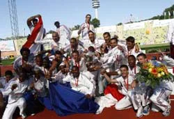 Formidable performance de l’équipe de France, dimanche, au stade olympique de Munich. Les Bleus ont conservé leur titre en Coupe d’Europe, chez les garçons, terminant à égalité de points et de victoires individuelles avec l’Allemagne, mais avec un plus grand nombre de deuxièmes places.Alors que les Françaises, deuxièmes, sont seulement devancées par l’intouchable Russie. Une deuxième journée marquée par les victoires individuelles de Ladji Doucouré sur 110 m haies, Bouabdellah Tahri au 3000 m, Muriel Hurtis au 200 m et Eunice Barber en longueur.