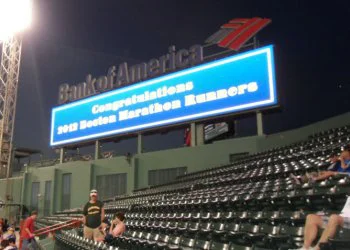 Remise de la médaille puis retour à l’hôtel, distant d’environ 20’ à pied. Comme à NY, félicitations de nombreux promeneurs (c’est sur que l’on n’est pas à Paris). Douche et repos seront le programme de l’après-midi. Les coups de soleil pris durant l’épreuve commencent à se faire sentir. Dans la soirée, nous allons visiter le magnifique stade des Red Sox, club de Baseball de la ville puis nous traversons la rue pour aller nous restaurer au buffet dansant prévu en l’honneur des marathoniens.