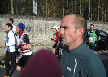 Plus de 1300 concurrents sont annoncés. Le coup de feu retentit à 9h dans le parc du château. Avec Pascal, nous prenons la roue des meneurs d’allure. Pas trop d’encombrement, néanmoins, on accuse 40’’ de retard au km2 que nous aurons déjà comblé au km5 : l’allure yo-yo ne fait que commencer. Au km10, Pascal, un peu énervé par cette cadence irrégulière, part aux avants-postes. Je ne le reverrais que… sur la ligne d’arrivée avec un record à la clé : bravo Pascal, surtout 3 semaines après l’écotrail. On continue à faire l’accordéon mais malgré tout, on réussit à passer le semi en un peu plus d’1h45’. Je croise, de temps à autre, Isabelle qui nous encourage : merci Isa. Arrive ensuite la pause-pipi (pensée pour Marc). Là, les meneurs vont nous faire un festival : je mettrais près de 8 km à les rejoindre.