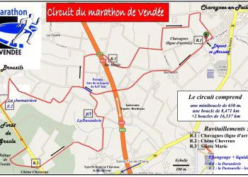 Départ de Chavagnes-en-Paillers. Itinéraire composé de 90 % de bitume et 10 % sur chemins stabilisés. De très faible dénivelé, le circuit est composé d’une petite boucle de 0,650 km, suivie d’une boucle de 8,471 km puis de deux autres de 16,537 km traversant les communes de Chavagnes en Paillers et des Brouzils, ainsi que la forêt de Grasla. 3 postes de ravitaillement et 2 zones d’épongeage sont installés sur le circuit. Arrivée au complexe sportif où l’on vous propose consigne, vestiaires et douches. Le temps imparti pour effectuer le marathon est de 6h.