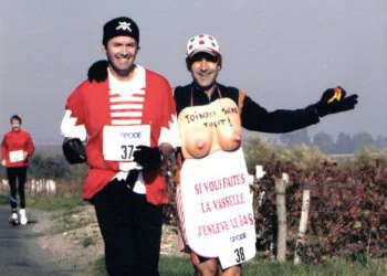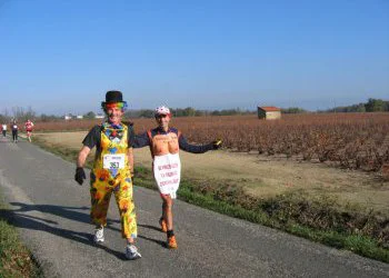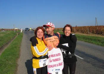 Nous poursuivons notre périple en traversant plusieurs châteaux. Bien sûr, nous n’oublions pas de nous abreuver. Antoine, avec sa tenue affriolante, manque, à plusieurs reprises de se faire violer par un groupe de Grecs. Comme au Médoc, nous étions partis sur une base de 5h30. Mais notre grande expérience vinicole nous a permis de terminer en 5h02. Récompense à l’arrivée, en l’occurrence un tastevin ce qui change un peu de la traditionnelle médaille.