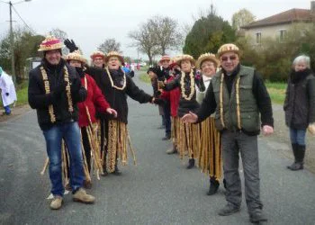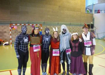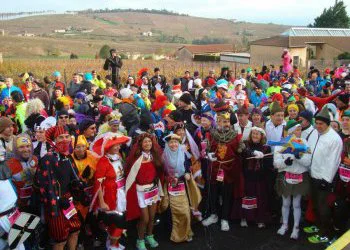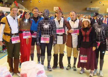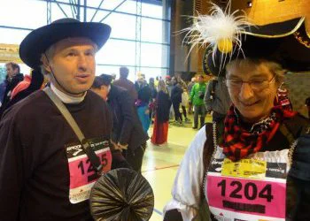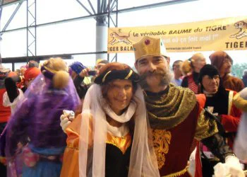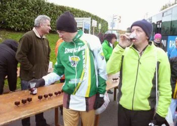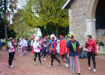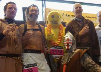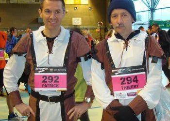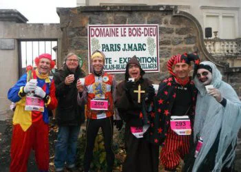 Le samedi matin, il fait frisquet dehors, beaucoup de vent aussi. Après le petit déjeuner, nous rejoignons le site pour nous emmener, en bus, sur le lieu du départ de l’épreuve à Fleurie. Pas d’objectif chrono sur ce marathon, si ce n’est d’emmener Thierry à bon port pour son 1er et, si possible, sous les 5h. A peine descendus du car, nous dégustons notre 1er verre de Beaujolais (ça démarre fort) avant de rejoindre la salle où nous allons attendre, patiemment, le départ et contempler les divers déguisements. Le thème choisi étant le moyen-âge, je serais déguisé en Robin des Bois. Hasard ou coïncidence, Thierry arborera une tenue similaire. Vers 10h, il faut sortir de la salle, ça caille.