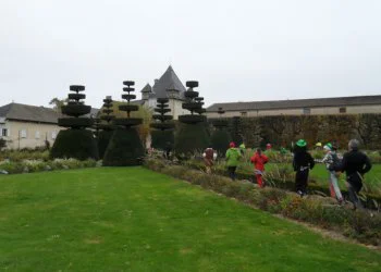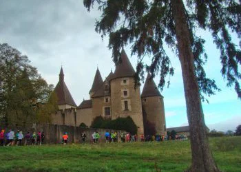 Après quelques belles paroles du speaker, le coup de feu retentit à 10h30. Malgré une 1ère descente de 2 km, ça part tranquille. Vers le 5ème km, nous atteignons le château de Corcelles. Les paysages sont somptueux. Au loin, les sommets les plus hauts sont recouverts d’un blanc manteau. Km10 : c’est maintenant l’entrée dans le domaine du château de Pizay, entouré de ses jardins à la française dessinés par Le Nôtre. Les ravitaillements œnologiques faisant surement leur effet, mon poulain Thierry commence à s’emballer. Nous réduisons quelque peu le rythme. Pour ce qui est des ravitaillements, justement, on ne sait plus où donner de la tête. Entre ceux officiels de l’organisation et ceux officieux proposés par l’habitant, on s’y perd. Au km15, le château de la Terrière nous accueille aux sons de ses puissants cors de chasse. Pour fêter ça, avec mon fidèle lieutenant, on s’en jette encore un petit derrière la cravate. Nous passons le château Les Ravatys puis celui de La Brasse pour atteindre, sans trop d’encombres, le semi-marathon que nous franchissons avec un bon matelas d’avance par rapport à l’objectif initial.