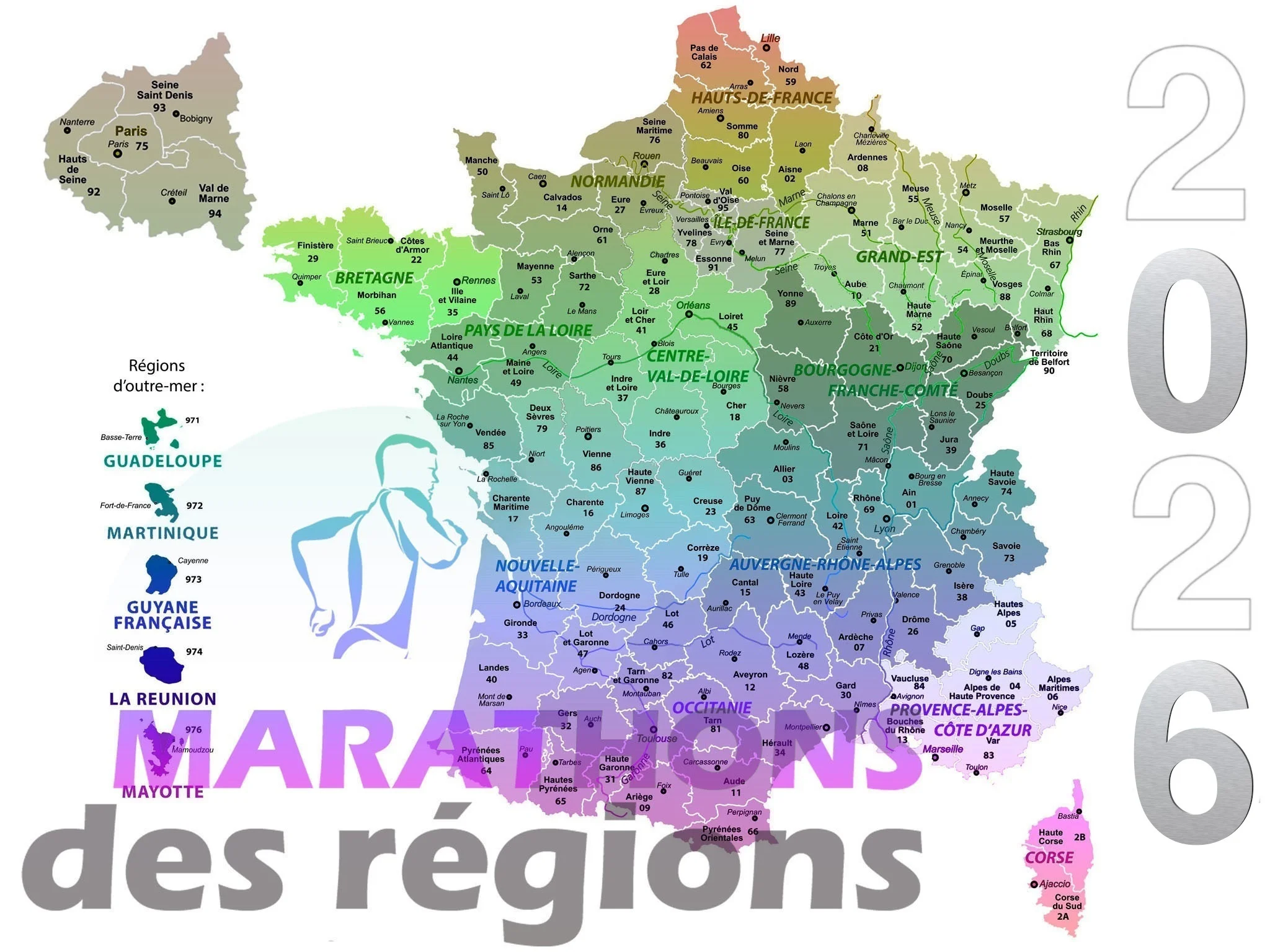 Je me suis intéressé au nombre de marathons courus par régions. Je les ai répertorié et j’en suis arrivé au nombre de 101 pour 2026. J’y ai ajouté quelques marathons nature ne faisant pas tout à fait la distance réglementaire de 42,195 km mais se situant, quand même, entre 42 et 43 km. Pour info, les départements comportant un astérisque sont ceux dans lesquels un marathon est déjà organisé.