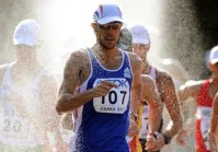 Yohann Diniz a la banane en ce jeudi après-midi. Cinq jours après ses 3h38’45" à Dudince en Slovaquie sur 50 km marche, nouveau record de France, le Tricolore arpente les allées du Marathon Expo, la gigantesque foire de la course à pied organisée Porte de Versailles en préambule du marathon de Paris. Le vice-champion du monde d’Osaka a déjà bien récupéré. Au-delà du chrono, c’est la manière qui a impressionné en Slovaquie. Après quarante kilomètres avec le « frein à main », le protégé de Pascal Chirat a fini très fort, bouclant les dix derniers kilomètres en 41’45". La preuve que le travail effectué depuis sept mois et son abandon sur 50 km marche lors des Jeux olympiques de Pékin est déjà entrain de payer. Illustration.